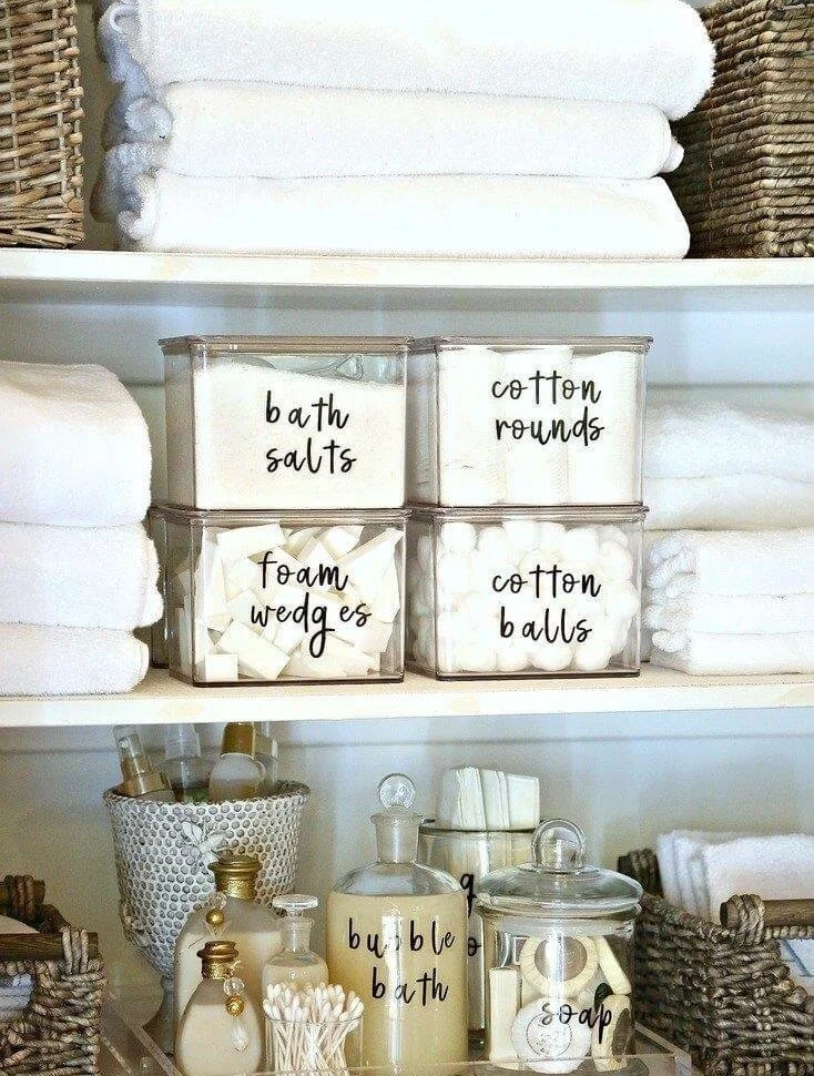 Bathroom shelf with neatly organized bath items, including labeled containers with bath salts, cotton rounds, foam wedges, cotton balls, bubble bath, and soap, alongside folded white towels and wicker baskets.